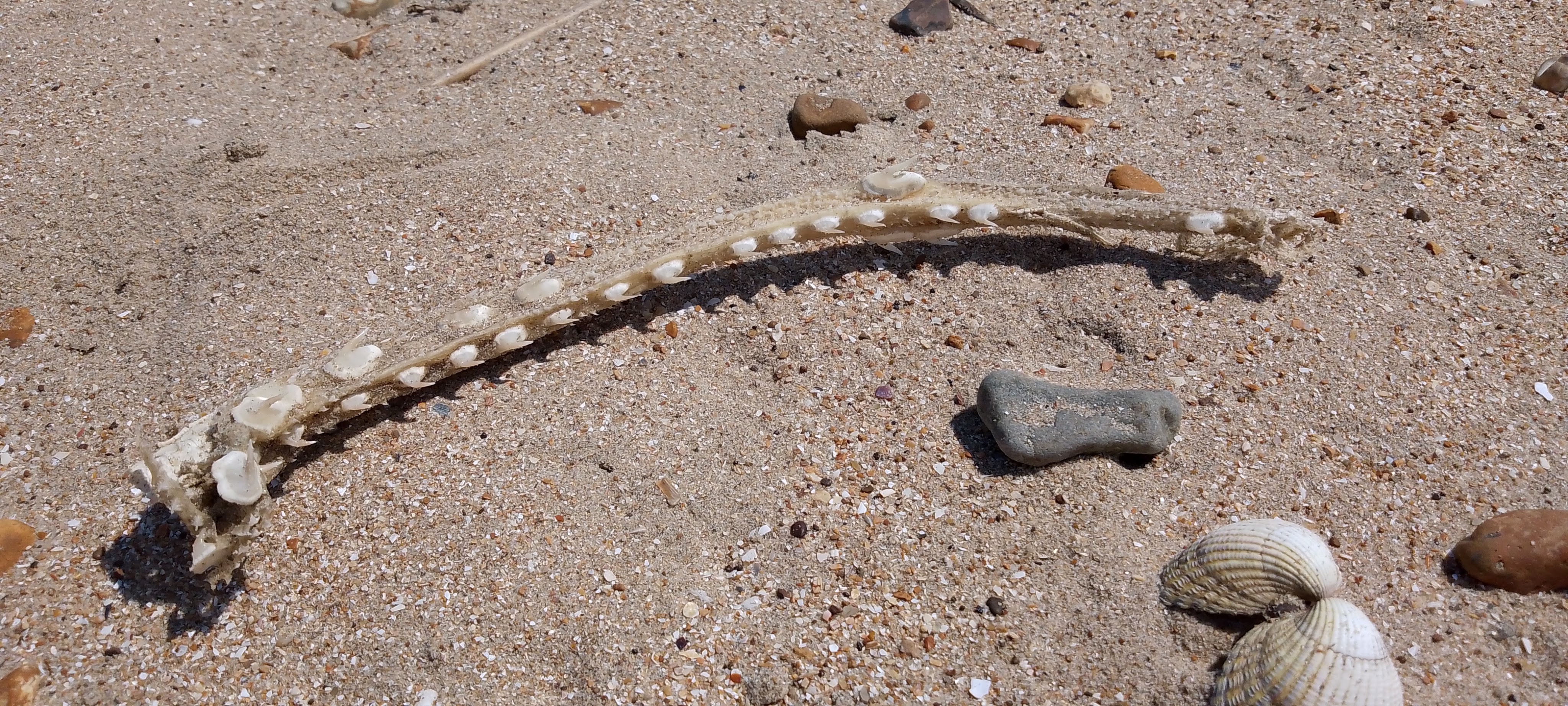 (which I later found out were spider crabs!), mermaids purses, whelk egg clouds, quite a few washed up dead dog fish, as well as the jaw bone of something with some very sharp teeth!.