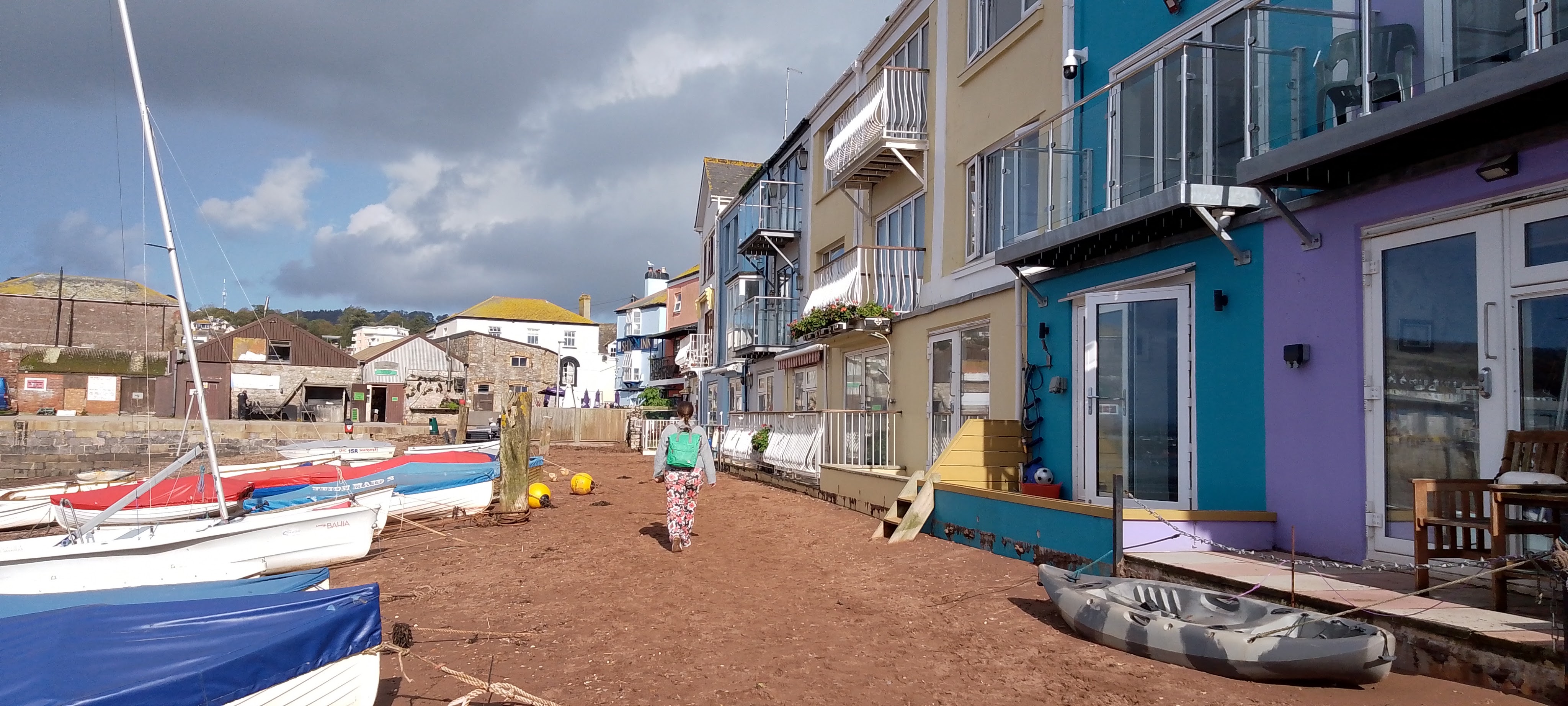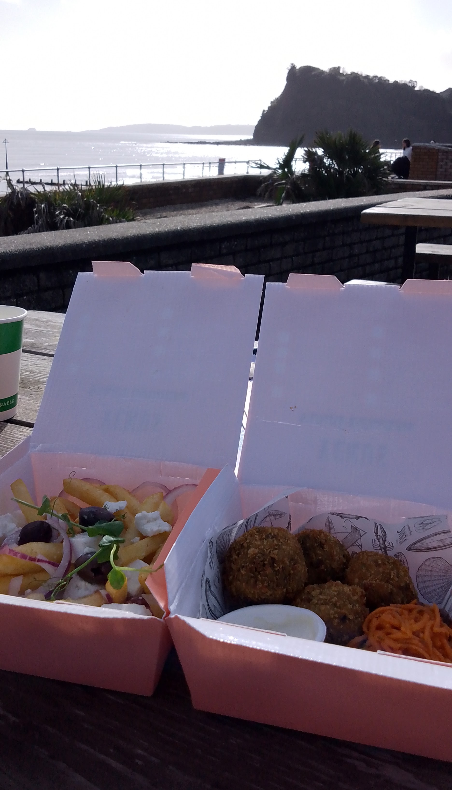 We walked further along the river beach than we had intended – not that that was a bad thing – initially because we were looking for a pub that my daughter had earmarked for lunch, and then, after discovering that their outside area was full (and it was too nice to sit inside), because we couldn’t find a way out as all the flood defences were in place. In the end we had to climb over one of the barriers in a not very elegant fashion. In need of food, we returned to the seafront, stopping at a cafe called Venus instead. They had lots of outside tables just across the road, and, although this did mean navigating my way down a set of steps and then crossing said road whilst holding a tray of drinks (tray carrying is not one of my greatest strengths even when only attempted for a short distance across a flat cafe floor!), we were soon sharing some delicious pea and mint arancini and loaded Greek fries, washed down with local Devon cider.