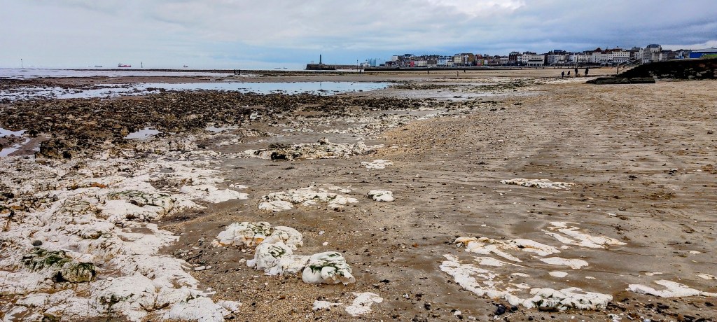 For our final walk we caught the train to Margate, and after breakfast at Wetherspoons, with a view overlooking the main sands, we walked along the coast to Westgate on Sea. The tide was right out and we were able to stroll along the beach, peering into the many exposed rock pools, which made a lovely change, and was a lot more fun than just marching along the promenade.