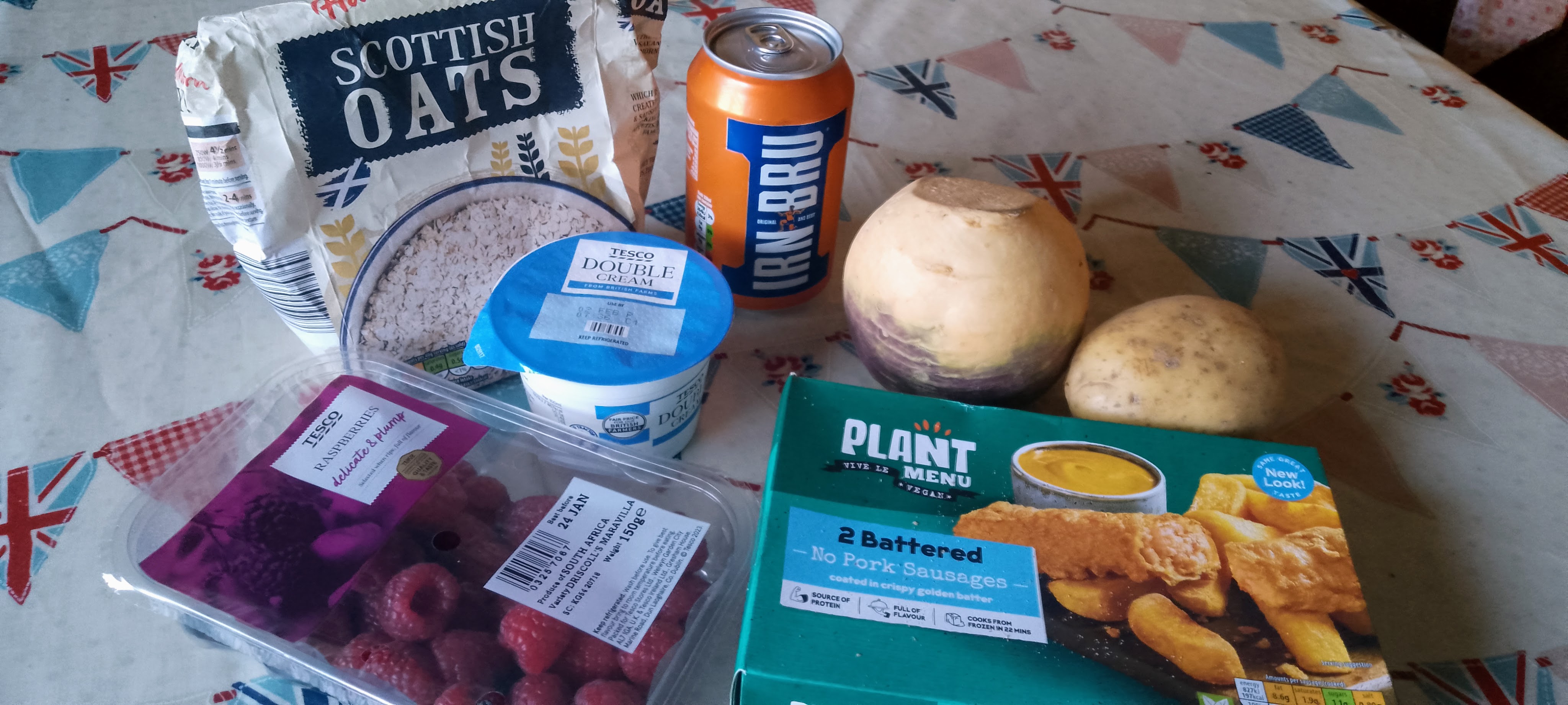 I also made myself a little Scottish supper that evening, listening to ceilidh music as I cooked. Luckily I had shopped in advance, and although I hadn’t been able to chase around looking for vegetarian haggis, I went for the ‘pick something fried/battered’ approach instead, and substituted a battered ‘sausage’. (I don’t know how much this is actually just a lazy stereotype, although arriving late at a Scottish caravan park some years ago, I was slightly aghast to find that the only veggie offering at the onsite takeaway, apart from just a portion of chips, was a deep fried cheese and tomato pizza!) I had neeps and tatties to go with it, washed down with a can of Irn-Bru, and also made some cranachan. As with my slightly over baked shortbread, I also slightly over whipped the cream – I’m not well, my head is like cotton wool!! – but otherwise it was very tasty.