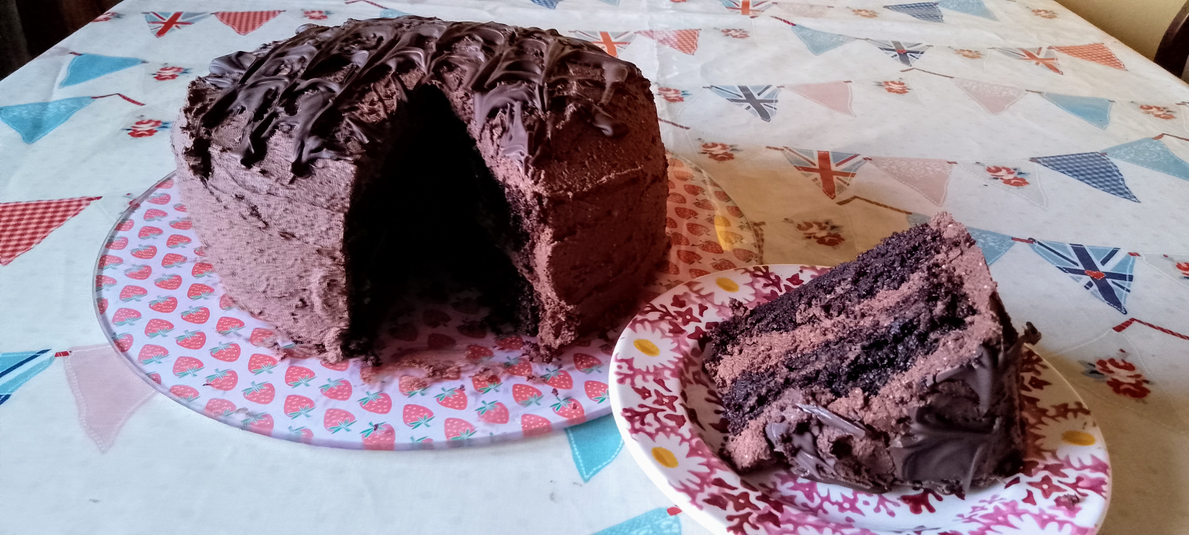 Yesterday was National Chocolate Cake Day, and to honour the occasion I had already invited my chocoholic younger son and his girlfriend around to enjoy a slice. They are both vegan and, over the last year in particular when I baked them a cake a month as part of their Christmas present, I have been completely converted to the fact that you can still make a really good cake without eggs. I am a particular fan of the Loving it Vegan website, and the recipes have given me great results every time. This was the chocolate fudge cake, and although it was a bigger undertaking than the shortbread and had to be done in multiple stages to avoid over fatigue, the end results were superb. Plus, living alone, it was nice to see some friendly faces when the only other people I had spoken to in over a week were the doctor and her receptionist, and that was on the phone!