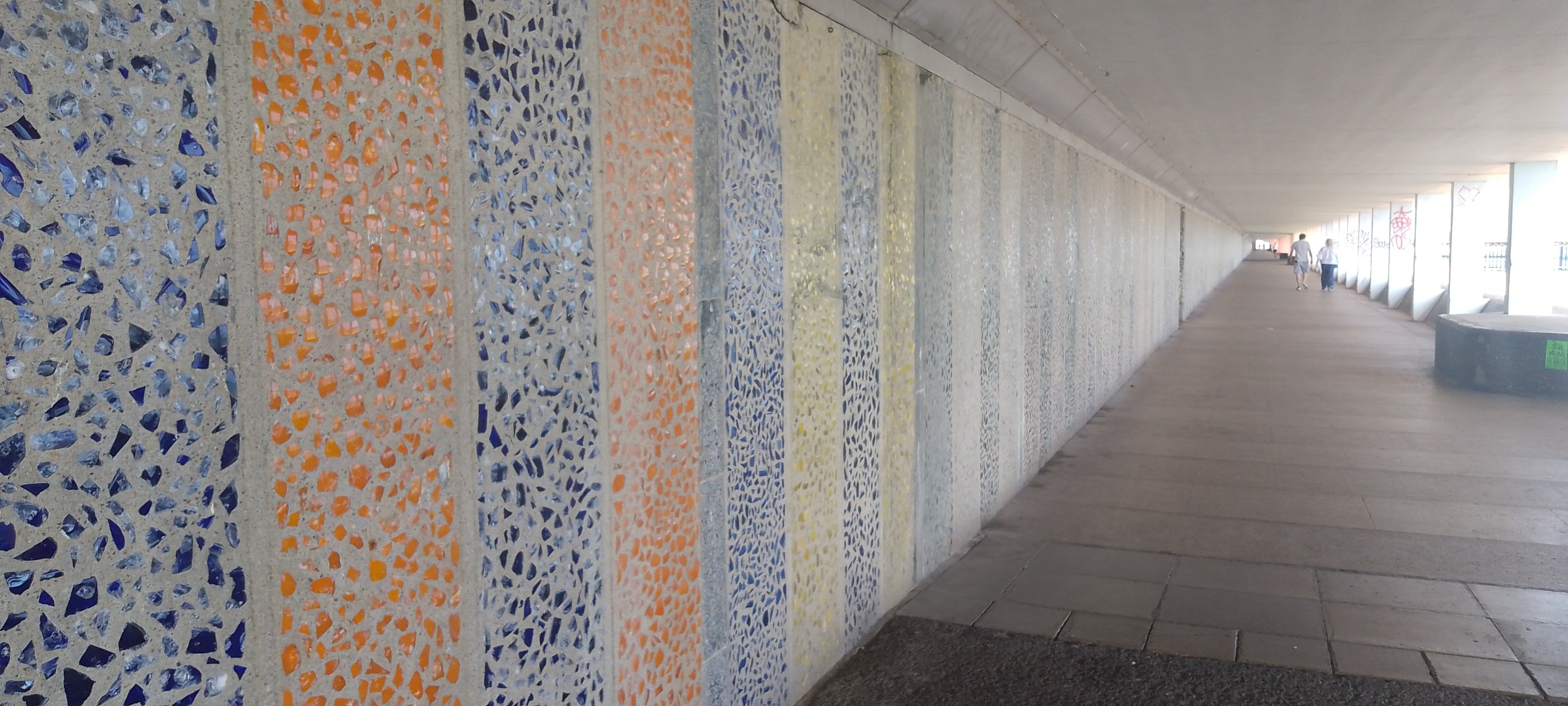 Continuing along the promenade, we came to Bottle Alley. Built in the 1930s as an undercover walkway for bad weather, it got its name from the multi coloured pieces of glass bottles that are embedded in the concrete walls. It was fascinating, and there were so many different colours, though it did smell a bit of wee in places!!