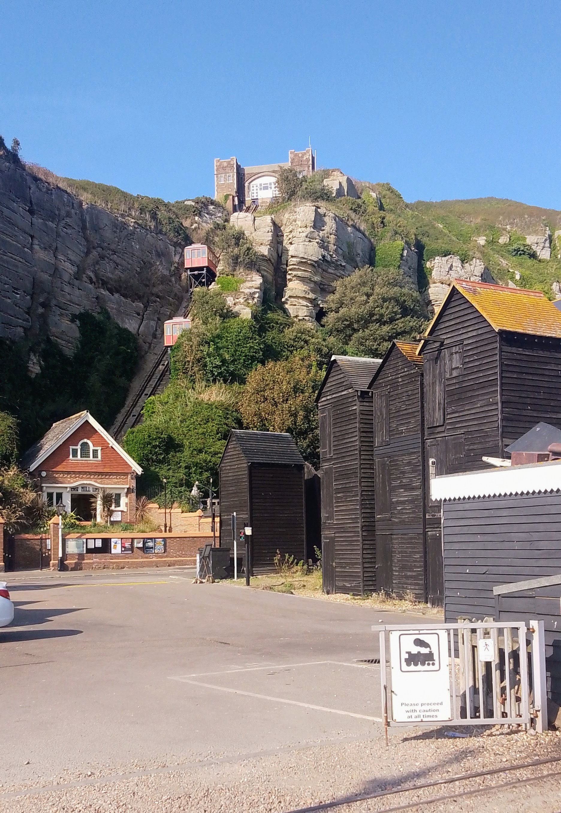 I had probably walked enough by this stage, but of course I wanted to keep going, and so we strolled past the amusements and crazy golf towards the iconic fishermen’s huts (known as Net Shops, these were designed for storing and mending the nets). There’s a miniature railway that runs along the seafront here, and there’s also a funicular railway that runs up the cliff.