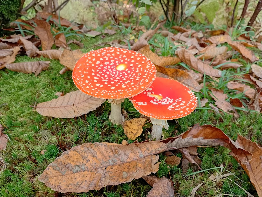 If we want a quick circular walk, we are lucky enough to be able to access footpaths through orchards in two different directions, but if we have a little more time, one of our favourite walks is to follow the North Downs Way from Canterbury to Chilham. After some smaller orchards, the path goes through Bigbury Wood, where there have been some fabulous toadstools, with these ones particularly perfect.