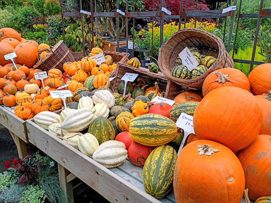 A walk is always improved with a coffee stop, either as a pit stop half way round or as a reward at the end, and we usually make time for a drink at the cafe at Badgers Hill Farm in Chilham. If you sit outside, as we always do, you can enjoy watching the chickens who scratch around the tables. There are a variety of different breeds, but I especially like the ones with feathery feet who look as if they are sporting a pair of trousers. They also have a really good garden centre and were stocking such a fabulous array of pumpkin and squash on our last visit that we couldn’t resist carrying a couple home with us.