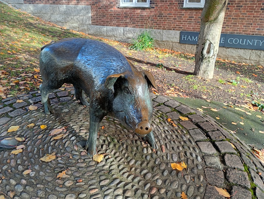 At this time of year, pigs are released into the New Forest to feast on acorns, chestnuts and beech mast, which are harmless to pigs but toxic to horses and cows. It’s known as pannage and is a custom that dates back to the time of William the Conqueror. Pigs are my favourite animal, and although I knew that realistically we were unlikely to spot any as they roam freely over a very wide area, I did keep a careful look out. I would have loved to have seen some rootling about for acorns. I would have settled for hearing for some snuffling in the undergrowth. But sadly there were none in evidence in the part of the forest that we passed through. (But here’s a handsome Hampshire Hog that I spotted in Winchester!)
