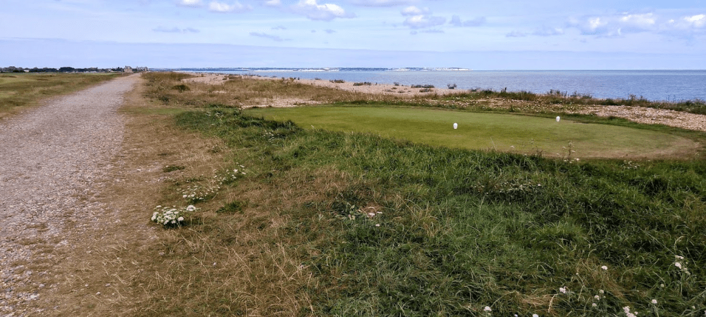 I don’t know how likely you are to be hit by a flying golf ball along here, but the risk is possibly increased by the fact that there is one teeing off area (I know nothing about golf so don’t know what the official name might be) that is actually on the beach side of the path, and for the first time in the years that we have done this walk, we actually came across a group of men about to play from it. We weren’t sure whether they would rather us hurry ahead and leave them to play at their leisure, or whether it would put them off if we stood and watched and waited, but we decided that we should exercise caution and not risk a ball to the head and so chose the latter option. (Although I wasn’t sure whether they would appreciate being photographed so waited until they had moved off in pursuit of their balls before taking my own shot!)