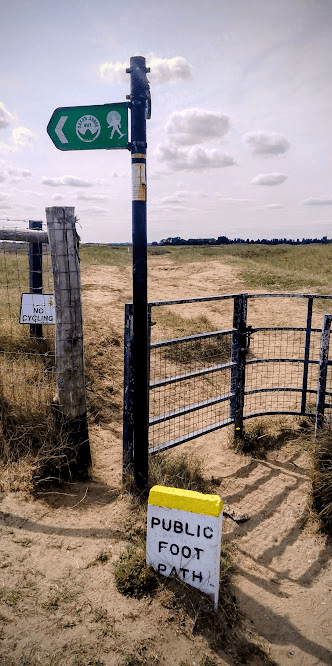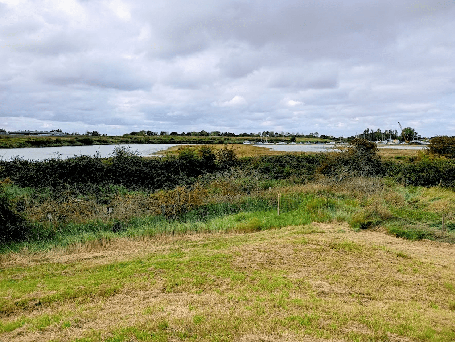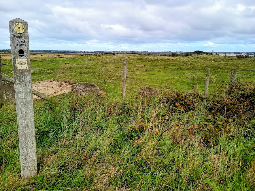 before I had to descend for a section of quite boring track walking, where the description was rather vague, there were no marker posts, and I wasn’t sure whether I was going in the right direction. My second moment of relief for the day was when I finally spotted an England Coast Path marker and realised that all was well, and I happily climbed up on another section of embankment walking, now with views of the rather ugly Sandwich Discovery Park (which I will be having the pleasure of seeing at close hand in Part 8.!).