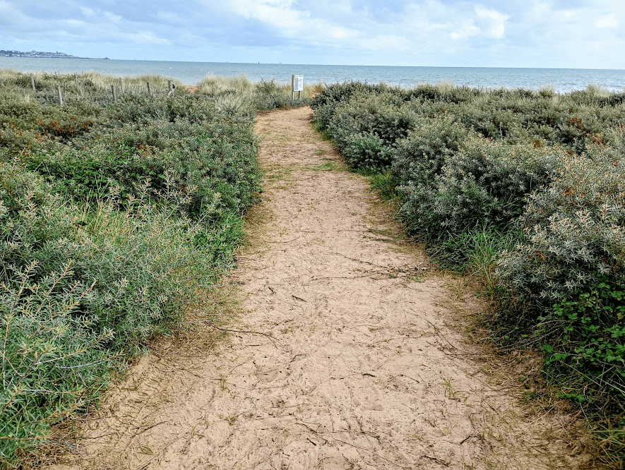 In fact there was so much buckthorn that it soon formed a complete barrier between me and the beach, and as it was a fair old step from the centre of Sandwich to this point for my current energy levels, I was starting to be in need of a sit down. I didn’t want to just plonk myself down on the path and was about to give up hope when, just before a fenced off area ahead, and at the point that the coastal path turned onto what gave the impression of being a private road, there was also a path on the right leading through all the buckthorn to the beach. Yay!