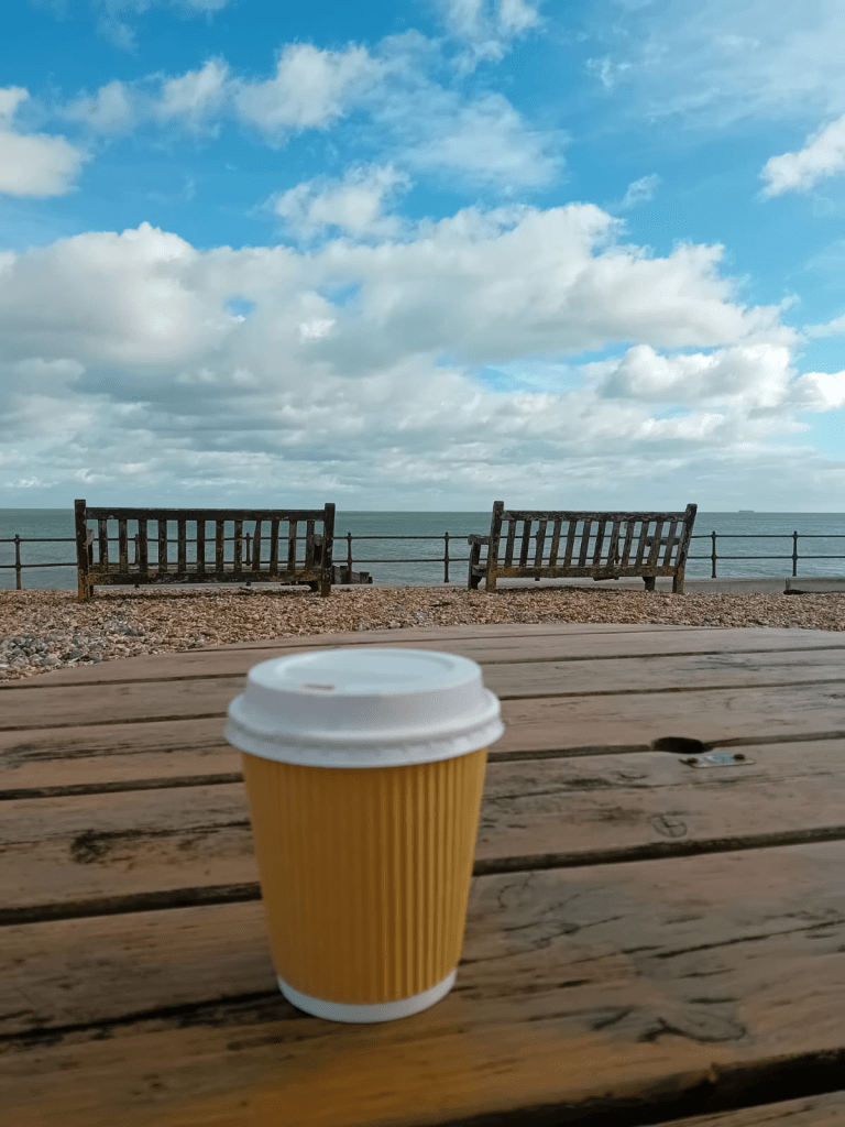 Our second al fresco drink wasn’t actually from a coffee shop but from the Zetland Arms pub in Kingsdown, near Deal. We had been walking off the breakfast which we had enjoyed at the Deal Pier Kitchen, and extravagantly decided that we deserved a hot chocolate as well. The pub is very cosy inside, but they also have plenty of tables outside, and we settled for one of these, right by the edge of the beach.