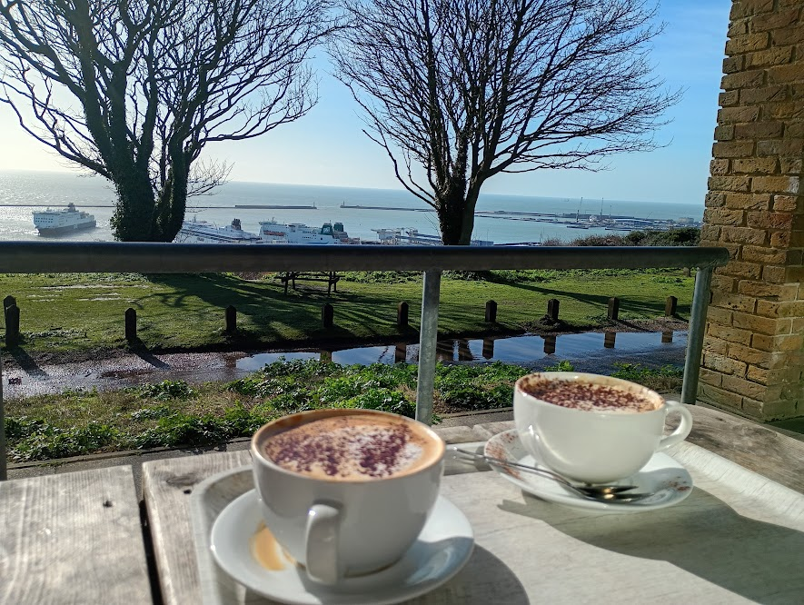 The best drink with a view was at the White Cliffs Visitor Centre in Dover. I’ve been going for walks on the cliffs since I was a child – way, way before there was ever a visitor centre and a cafe – and it’s definitely one of my happy places. Stopping for a drink is a fairly recent occurrence, coming about since I have had less energy for striding out along the clifftop, and as even the toil up from the town centre takes it out of me, but it is undeniably a nice treat. The cafe itself is very cafeteria-like inside, although it does have large panoramic windows – when they’ve not got people like us sitting at the tables right outside and blocking the view! The outdoor seating runs along the whole front of the centre and is very sheltered, and we happily sat and watched the ferries coming and going, listening to the sound of the on board announcements as they drifted up from the harbour, enjoying the feeling of some welcome sun on our faces.